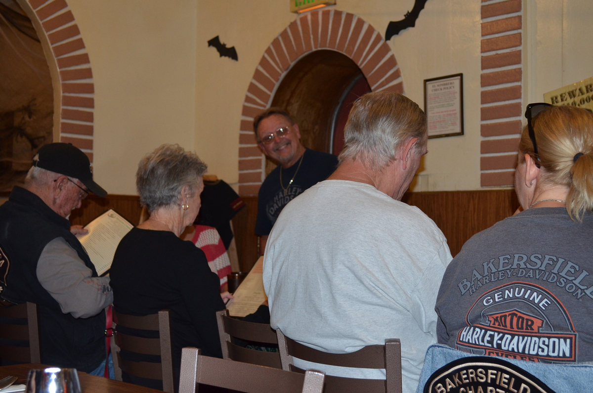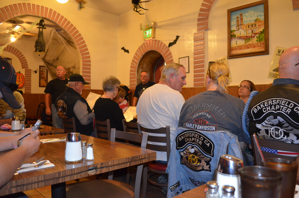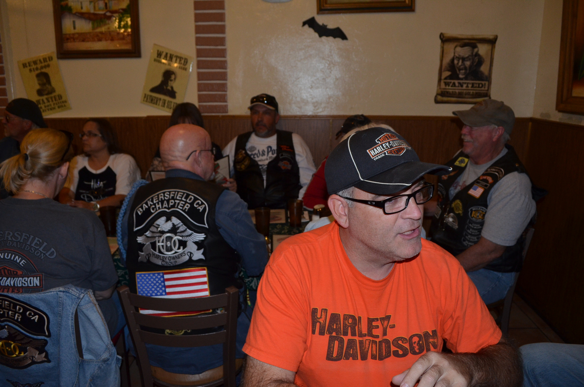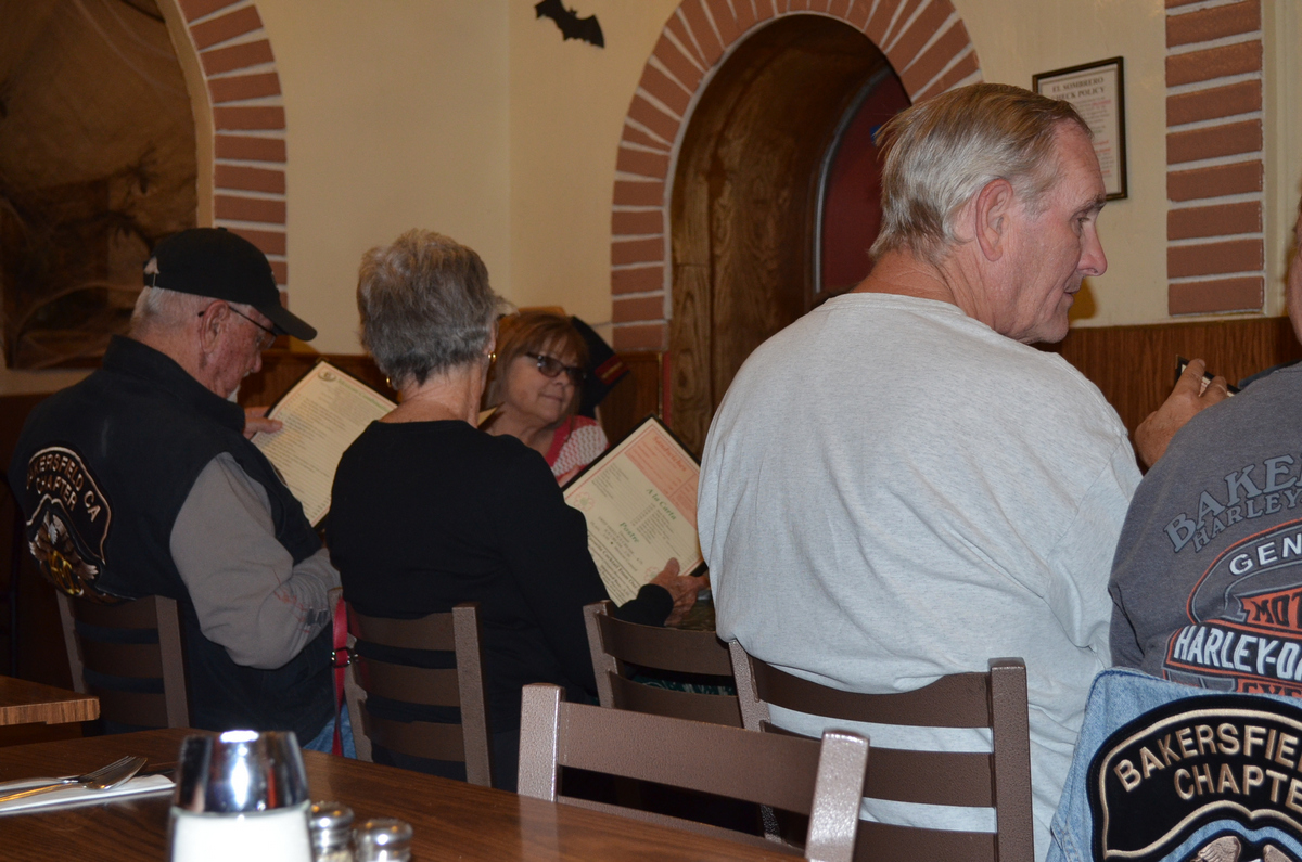 On October 20th 2013, the Bakersfield HOG Chapter #1580 rode approx. 26 miles on our monthly Dinner Ride to El Sombrero Mexican Restaurant. We rode Merle Haggard Road to China Grade Loop and through Hart Park and back up on Hwy 178 to the restaurant for good food and good conversation. Below are a few pictures of that evening. (Click on any picture for a larger image.)