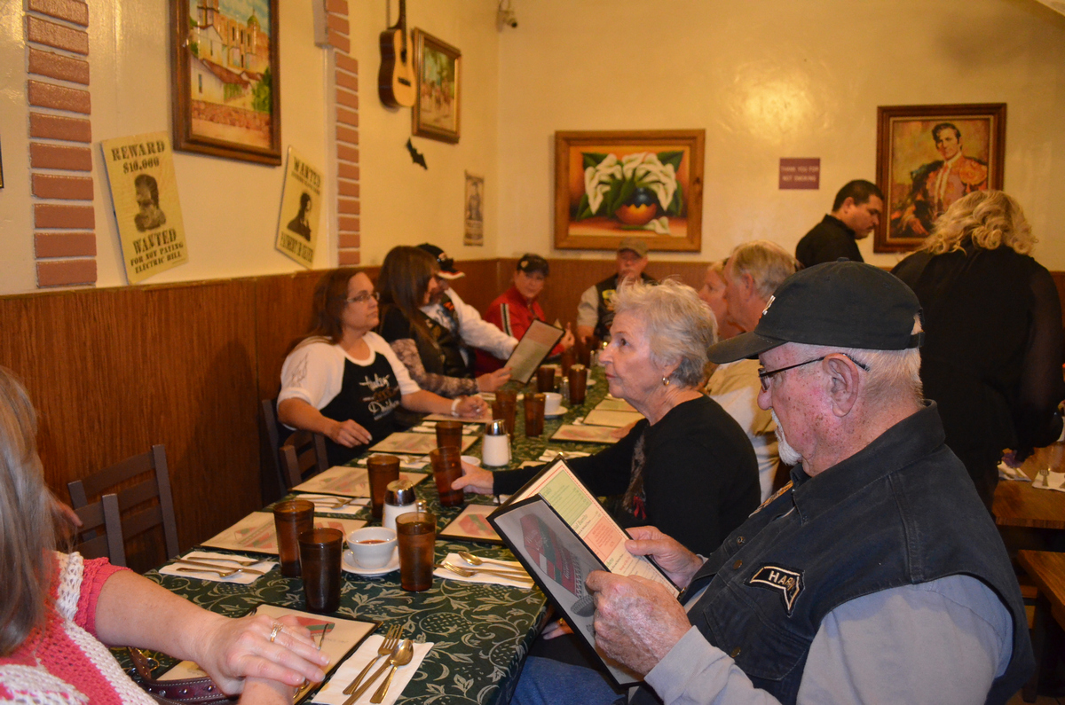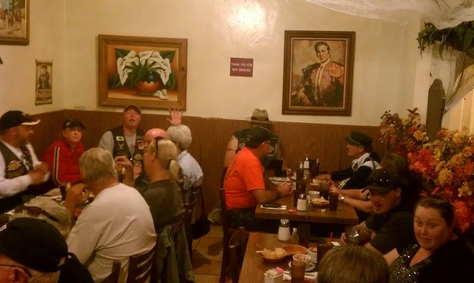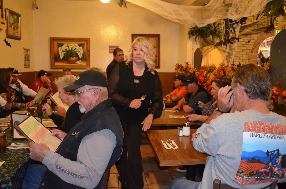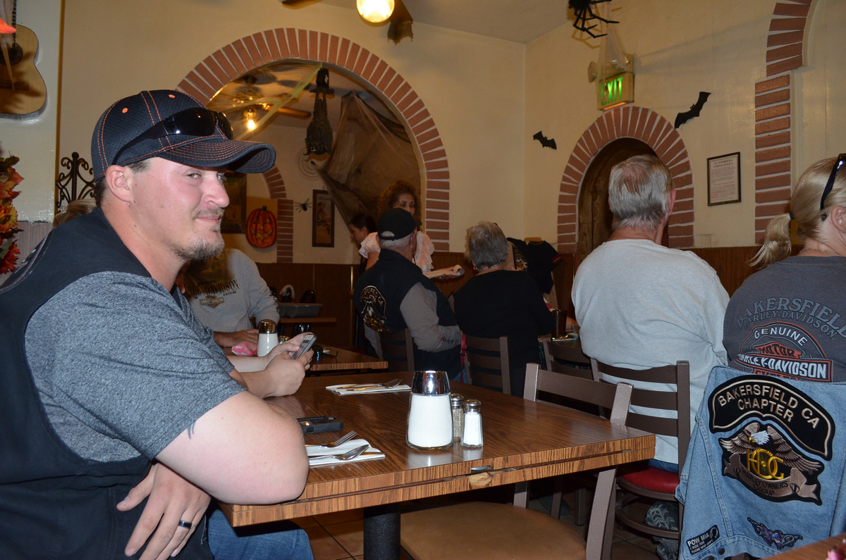 On October 20th 2013, the Bakersfield HOG Chapter #1580 rode approx. 26 miles on our monthly Dinner Ride to El Sombrero Mexican Restaurant. We rode Merle Haggard Road to China Grade Loop and through Hart Park and back up on Hwy 178 to the restaurant for good food and good conversation. Below are a few pictures of that evening. (Click on any picture for a larger image.)